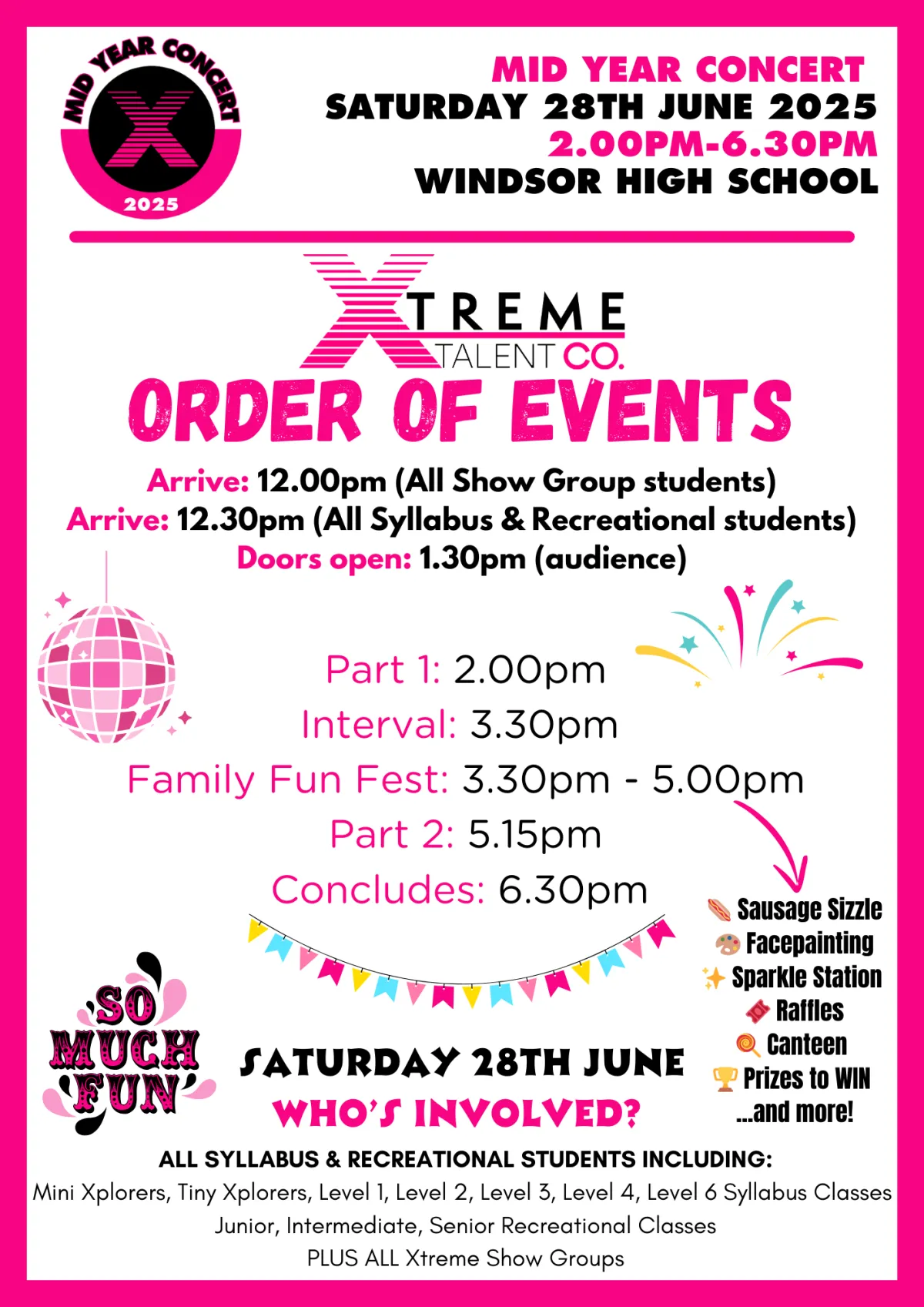 Mini Xplorers, Tiny Xplorers, Level 1, Level 2, Level 3, Level 4, Level 6 & all Junior, Intermediate, Senior Recreational Classes PLUS ALL Xtreme Show Groups